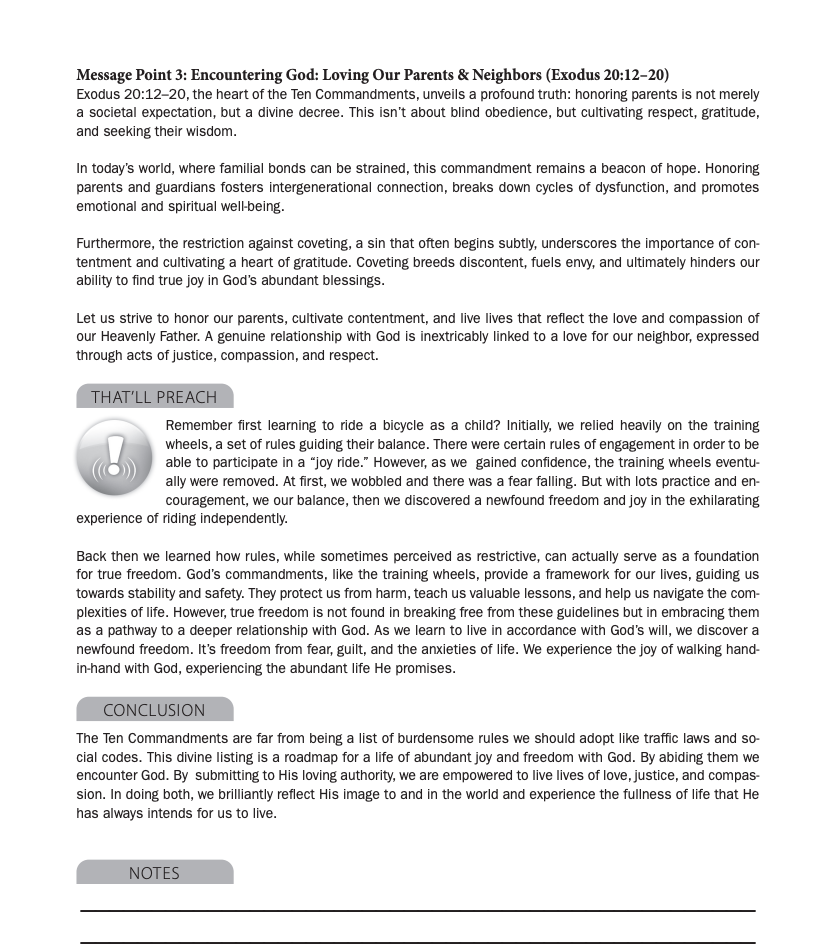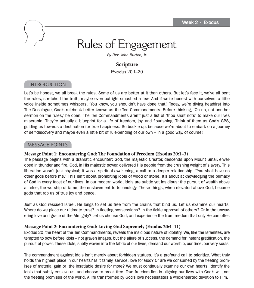 We envision this Precepts For Living® Pastor’s Edition being used along with the Precepts For Living® Annual Commentary. The sermons in this volume correlate with the Bible lessons in the Precepts For Living® Annual Commentary and matching Bible study age-level guides. That way, your sermons can be reinforced by Bible studies in Sunday School or other small groups. In this edition, we anticipate that you will appreciate these sermons presented as outlines and full texts. Even if you choose to develop your own sermon from the weekly Bible text, we believe this edition will prove invaluable and will undoubtedly be a catalyst for your preaching.
